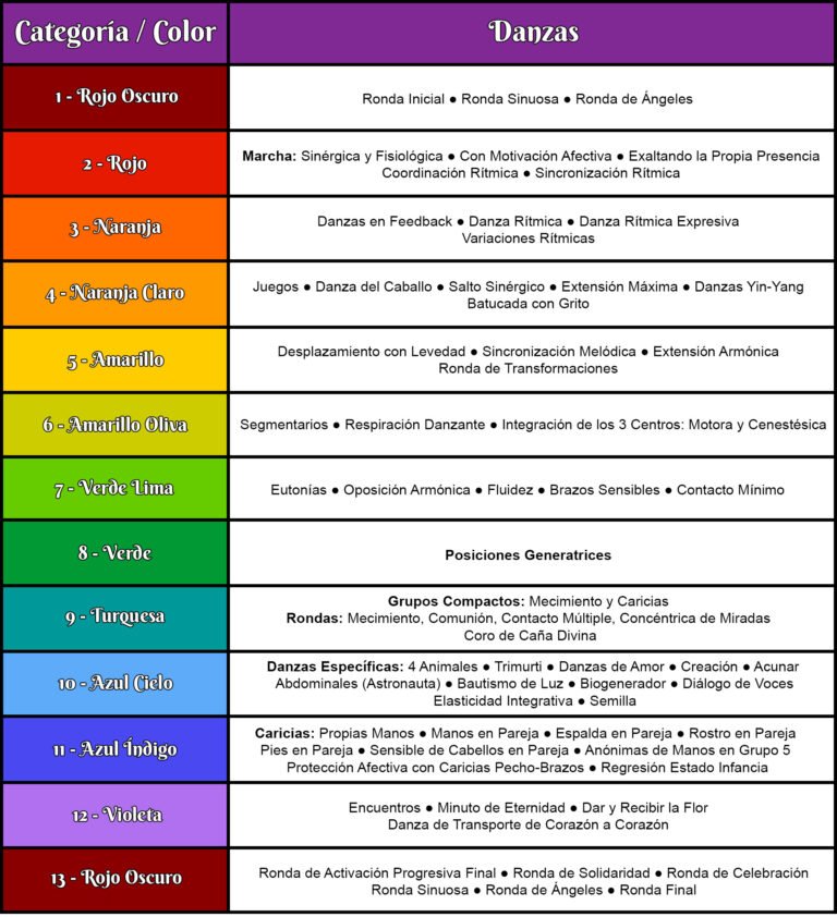 - 1 Tabla-danza que representa las 13 categorías de una sesión de Biodanza con sus danzas correspondientes.